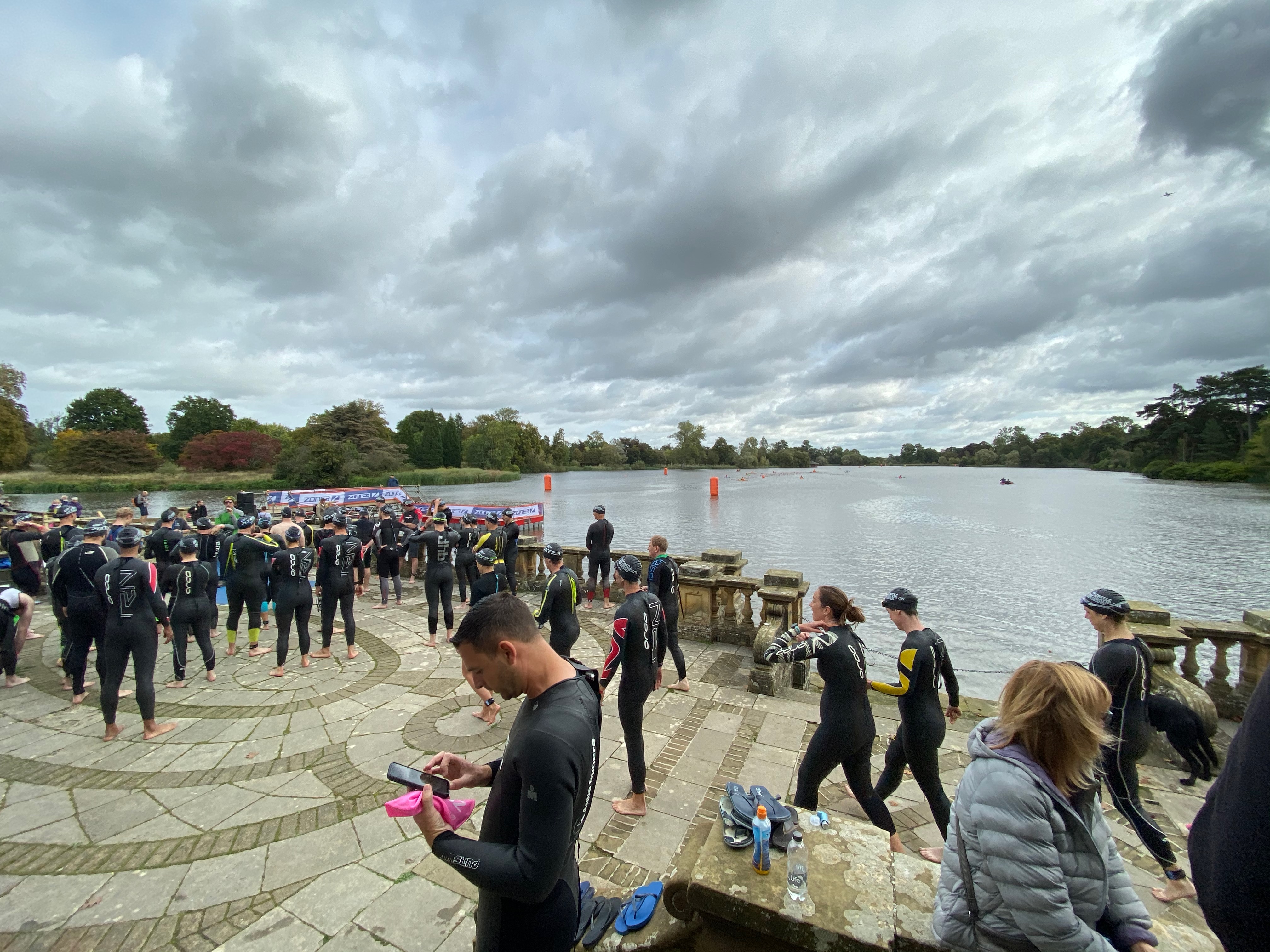 The diversion to the Tri parking took me down some lovely country roads and I eventually parked up and started the 10 min walk to the Competitors Village. Once I was surrounded by people the game mask came on and I followed signage to the Swim Registration in the Loggia right by the lake. You couldn’t ask for a more picturesque area – Italian statues in amongst Roman architecture. Timing chip and hat picked up, I then started the fun of trying to guide my parents to the lake as they had come to watch. We set them up on the edge of the lake and with the normal open water swimmers modesty I started to strip off and get the wetsuit on amongst the families on the lake edge.